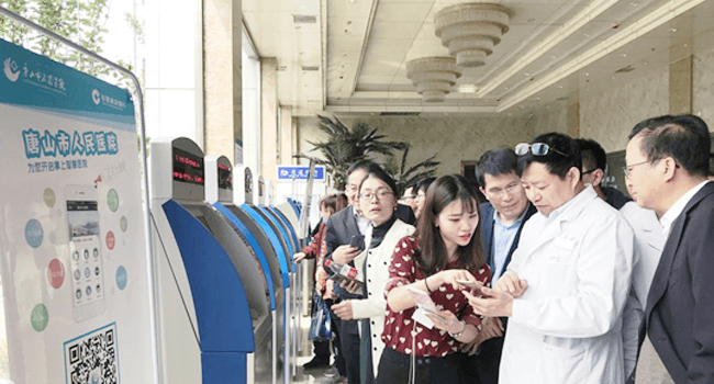 上線儀式結(jié)束后,參會領導一行在源啟工作人員的帶領下,現(xiàn)場觀摩體驗了銀醫(yī)通自助服務終端機的操作使用。