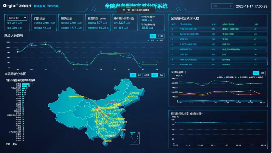 全院患者服務(wù)實(shí)時(shí)分析系統(tǒng)是我院改善服務(wù)管理的一項(xiàng)試點(diǎn)工程,我院信息科從數(shù)據(jù)角度切入,通過(guò)數(shù)據(jù)整合,讓數(shù)據(jù)“躍然屏上”,改變了以往各業(yè)務(wù)系統(tǒng)間的信息孤島、難以共享的歷史,實(shí)現(xiàn)對(duì)全院就診情況的實(shí)時(shí)總覽,并對(duì)就診人數(shù)趨勢(shì)、來(lái)院患者分布圖、全院各科室就診人數(shù)、支付渠道統(tǒng)計(jì)、預(yù)約掛號(hào)就診率等數(shù)據(jù)維度進(jìn)行細(xì)節(jié)深挖,實(shí)時(shí)監(jiān)測(cè)各項(xiàng)事關(guān)患者服務(wù)的數(shù)據(jù),從而通過(guò)數(shù)據(jù)維度改善就醫(yī)服務(wù)和流程,提升醫(yī)院的服務(wù)質(zhì)量和效率。